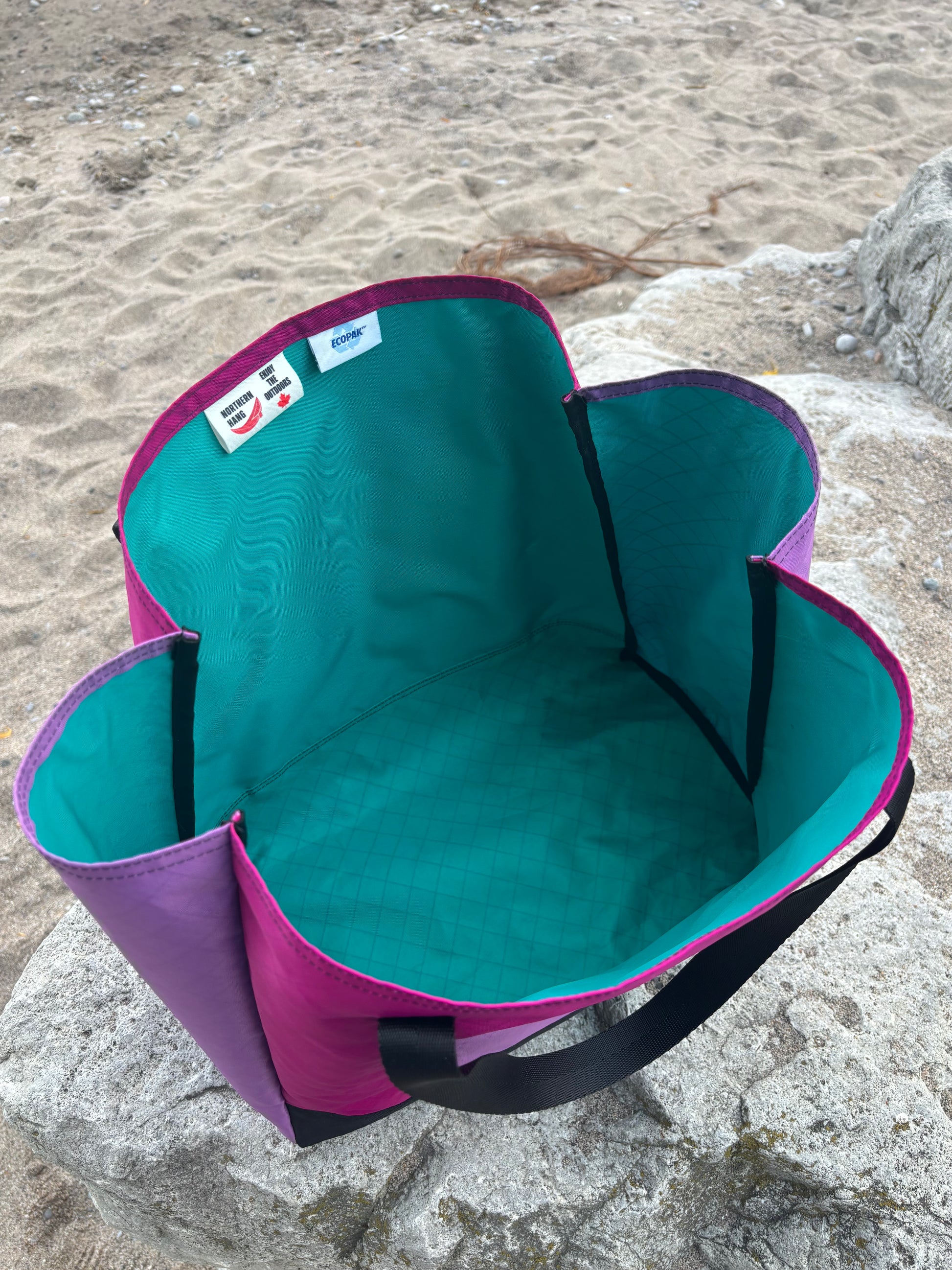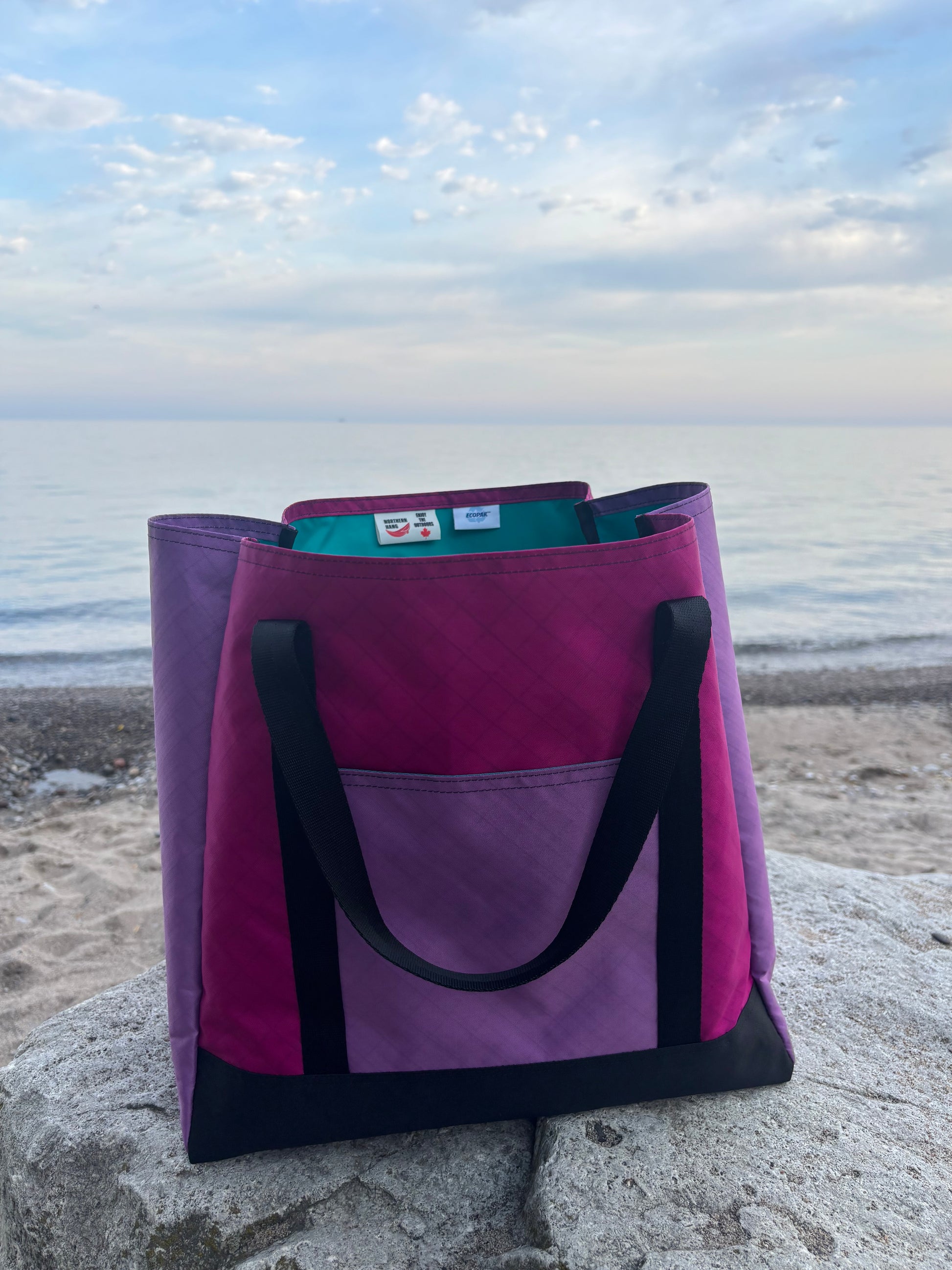 A versatile tote bag, with slip pockets on the front and back. Made with water resistant fabrics, this is perfect for the pool or beach!